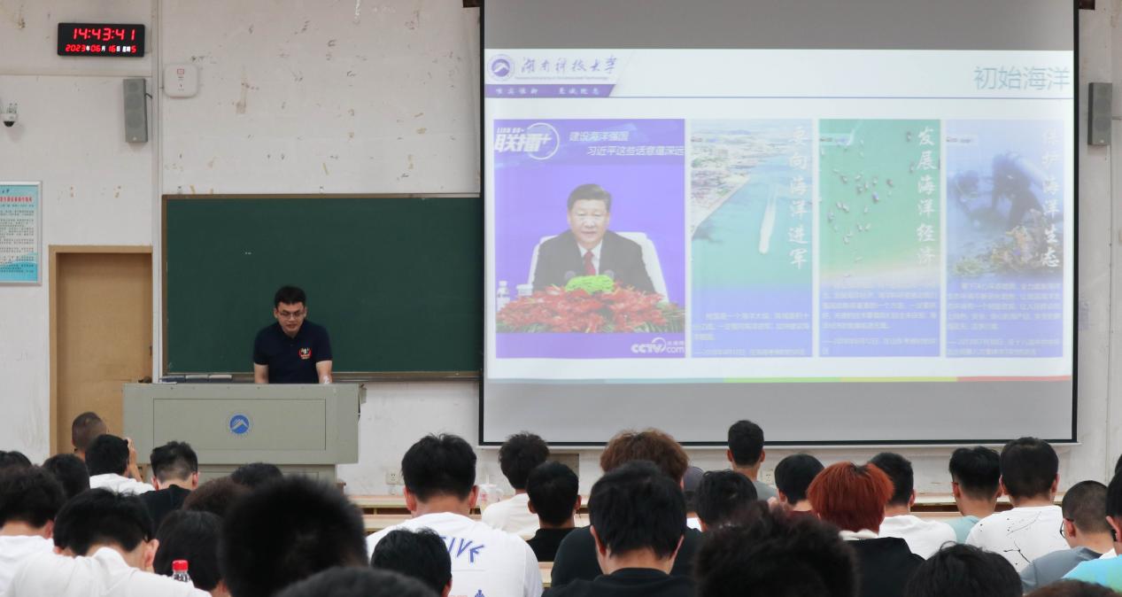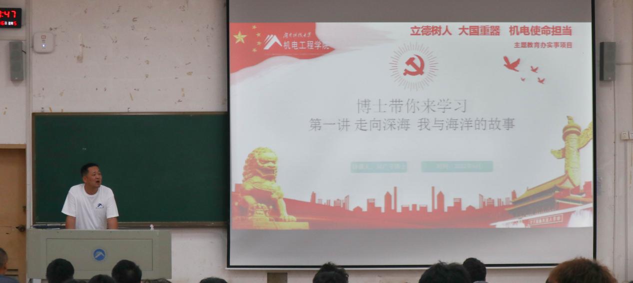 刘广平博士向同学们介绍了我国海洋资源的基本情况并强调了开展海洋资源勘探研究对国家发展的重要战略作用。他结合自身学习与科研工作实际,分享了在开展研究生课题研究期间克服的一些困难以及在参与完成“奋斗者号”海底沉积物采样实验时在海底的所见所闻以及深入浅出的将其博士期间的研究课题——适用于10000m水深的深海宏生物全程保真采集装备向同学们作了介绍。