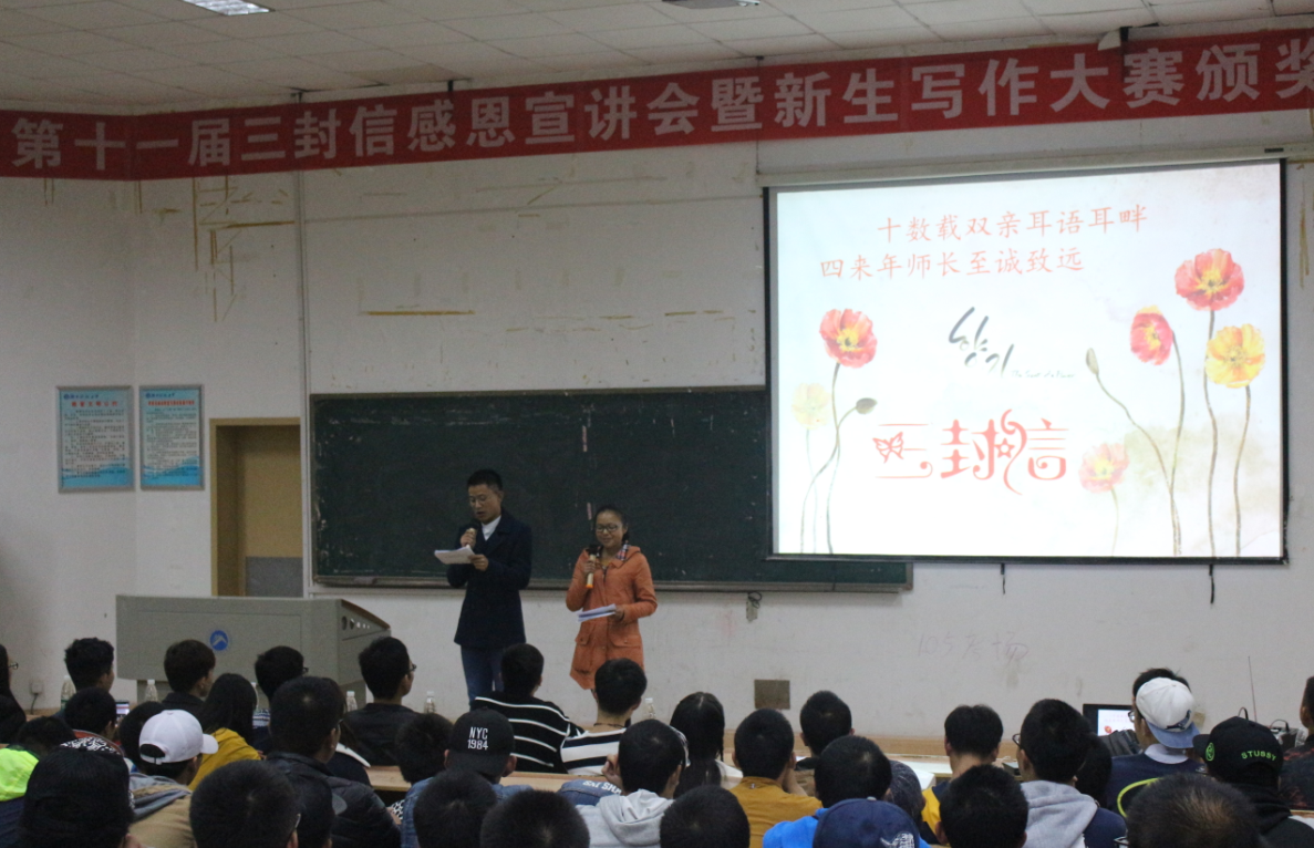 你感谢过你身边的人吗,那些离你最亲近的人,你的父母,你的老师,你的朋友,或许很多人都没有吧?11月20日19:00,我院于五教2-3教室召开第十一届“三封信”感恩宣讲会,给了16级新生一次说感恩的机会。我院14级辅导员唐翠柳老师,学生会主席辜建尧,团委第一副书记邓斌等主席团成员,以及建筑与艺术学院宣传部副部曾欢欢,材料科学与工程学院宣传部副部全顺出席本次宣讲会。宣传部部长梁泽曾宏与副部长田丽共同担任此次大会的宣讲人。