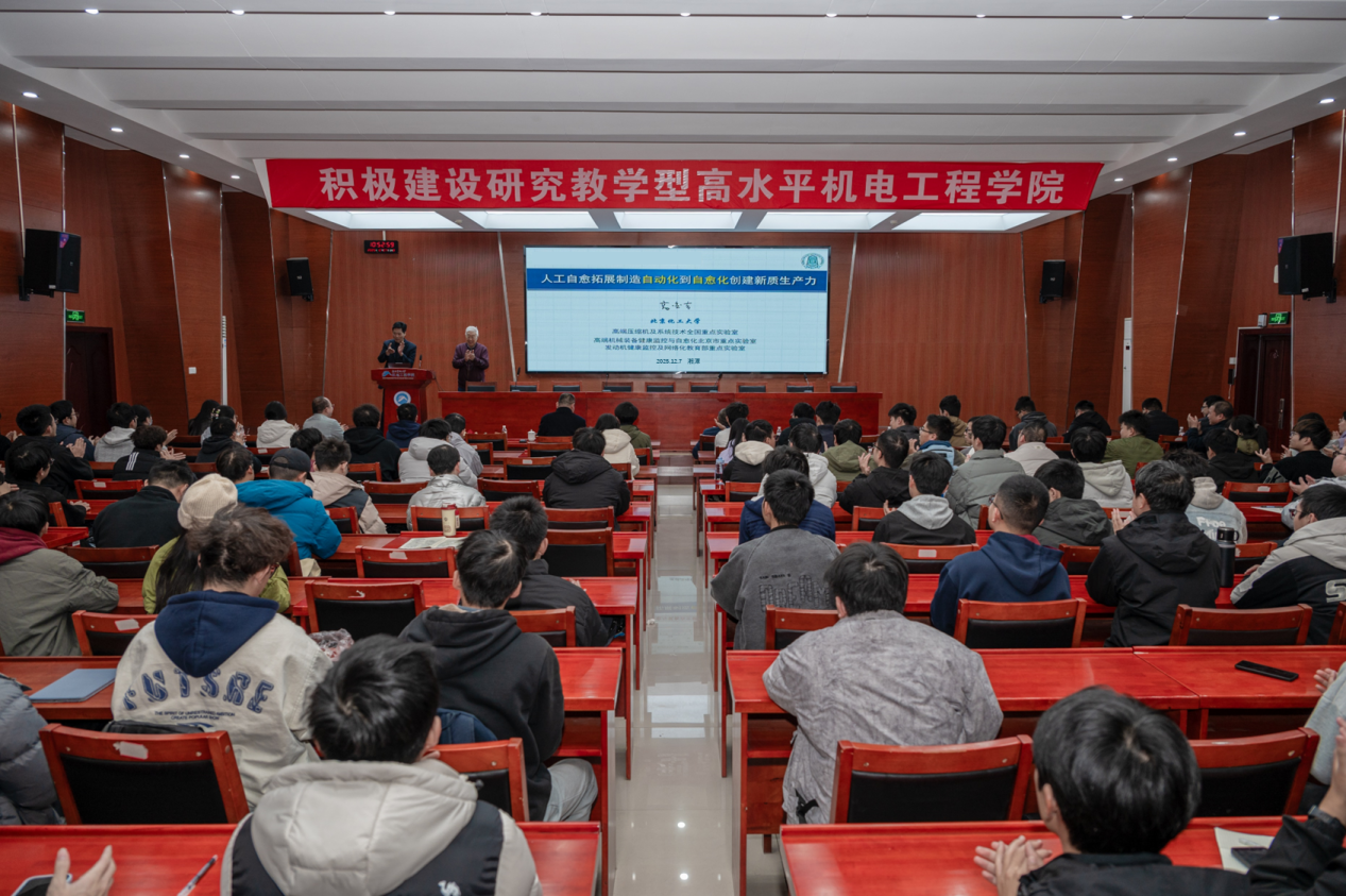 会前,高金吉首先来到5060全迅白菜特种运载装备振动控制技术实验室、海洋实验室和航空动力装备振动冲击实验室参观调研,了解科研平台的建设情况和成果进展。他勉励科研人员要面向国家重大战略需求,解决实际科学问题,形成科研闭环。随后,高金吉在立功楼六楼报告厅,为我校师生作了题为“人工自愈拓展制造自动化到自愈化创建新质生产力”的学术报告。报告从装备故障自愈工程的理念出发,深入剖析了如何通过智能诊断、自适应调控与系统自治,实现制造系统从“被动维修”到“主动防御”再到“自主优化”的跨越。报告中对“自愈化”与“新质生产力”内在关联的深刻洞察,以及对未来工业生态的前瞻展望,为我们提供了宝贵的学术引领与战略思考。此次报告不仅是知识的传递,更是创新思维的启迪,必将对学校学科建设、科研攻关与人才培养产生积极的推动作用。