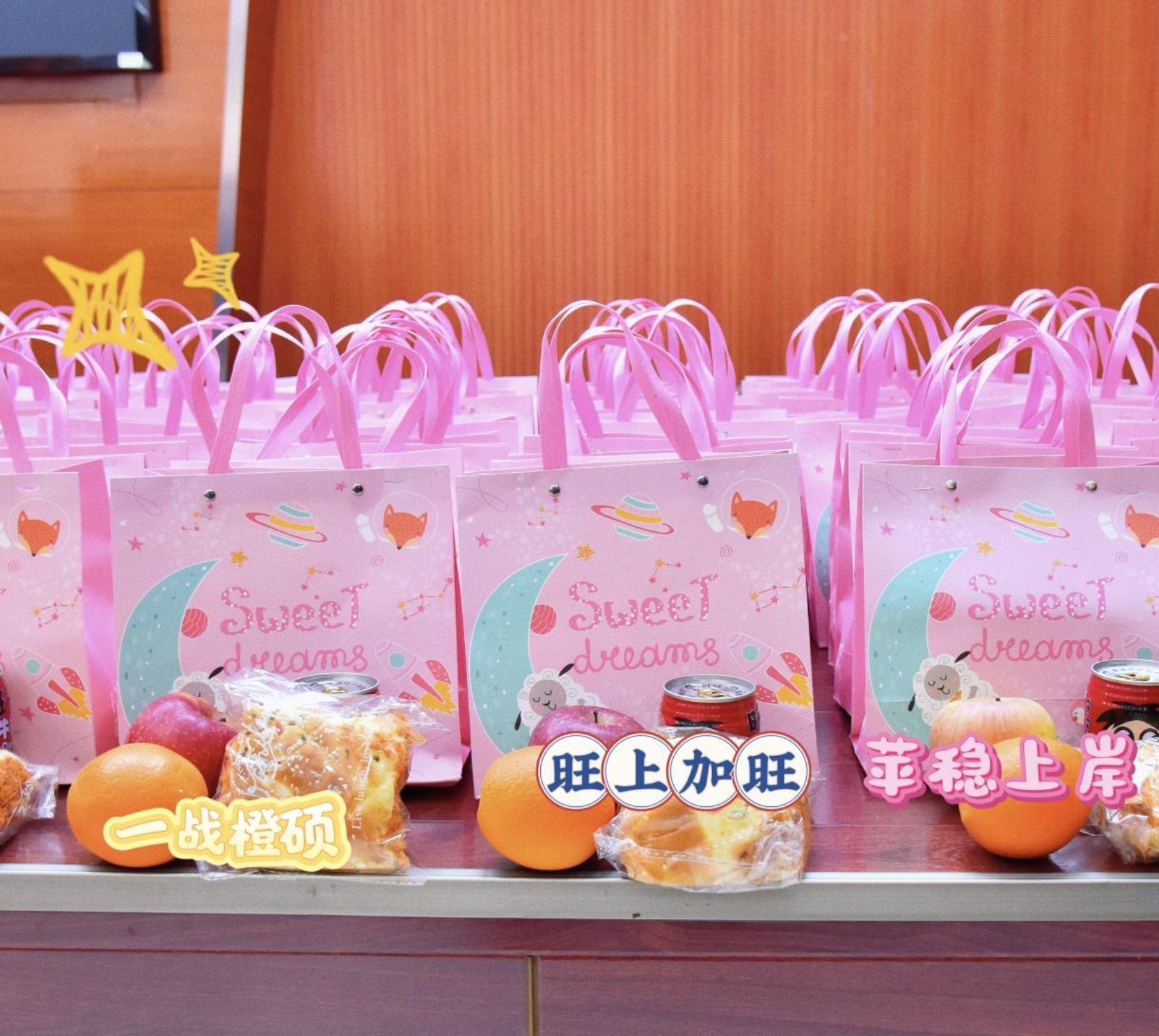 拼搏蕴蓄力量,礼包满载祝福。在赠送环节,杜书记及辅导员为备考学子送上精心准备的“暖心礼包”。礼包内含苹果、橙子、旺仔及面包等寓意美好的食品,分别寄托 “苹” 稳上岸、一战 “橙” 硕、旺上加旺、面面俱到的祝福。学院还邀请本校研究生担任 “送福使者”,他们结合备考经历分享应试技巧与心态调节方法,为学弟学妹注入信心。学子们手捧礼包、笑意满怀,纷纷表示将带着这份温暖鼓励全力以赴、冲刺考场。